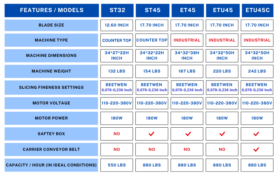• ET45 Type Machine Dimensions 33.50*31.50*(h)37.50inch and Approximate Weight 235Ibs. The blade width is 17.70inch and it is produced as 110V / 220V / 380V